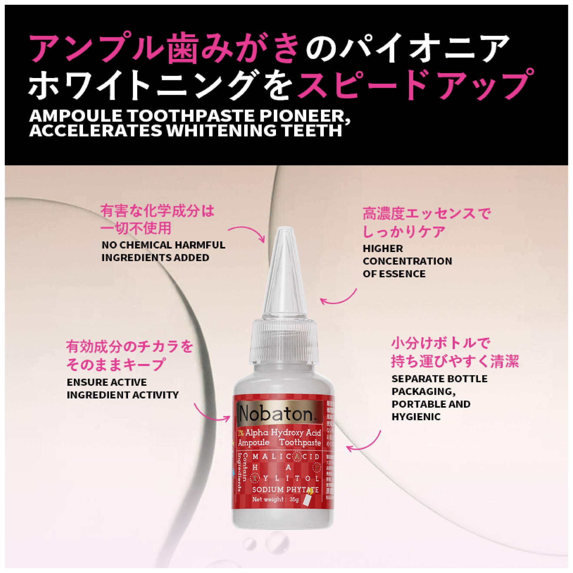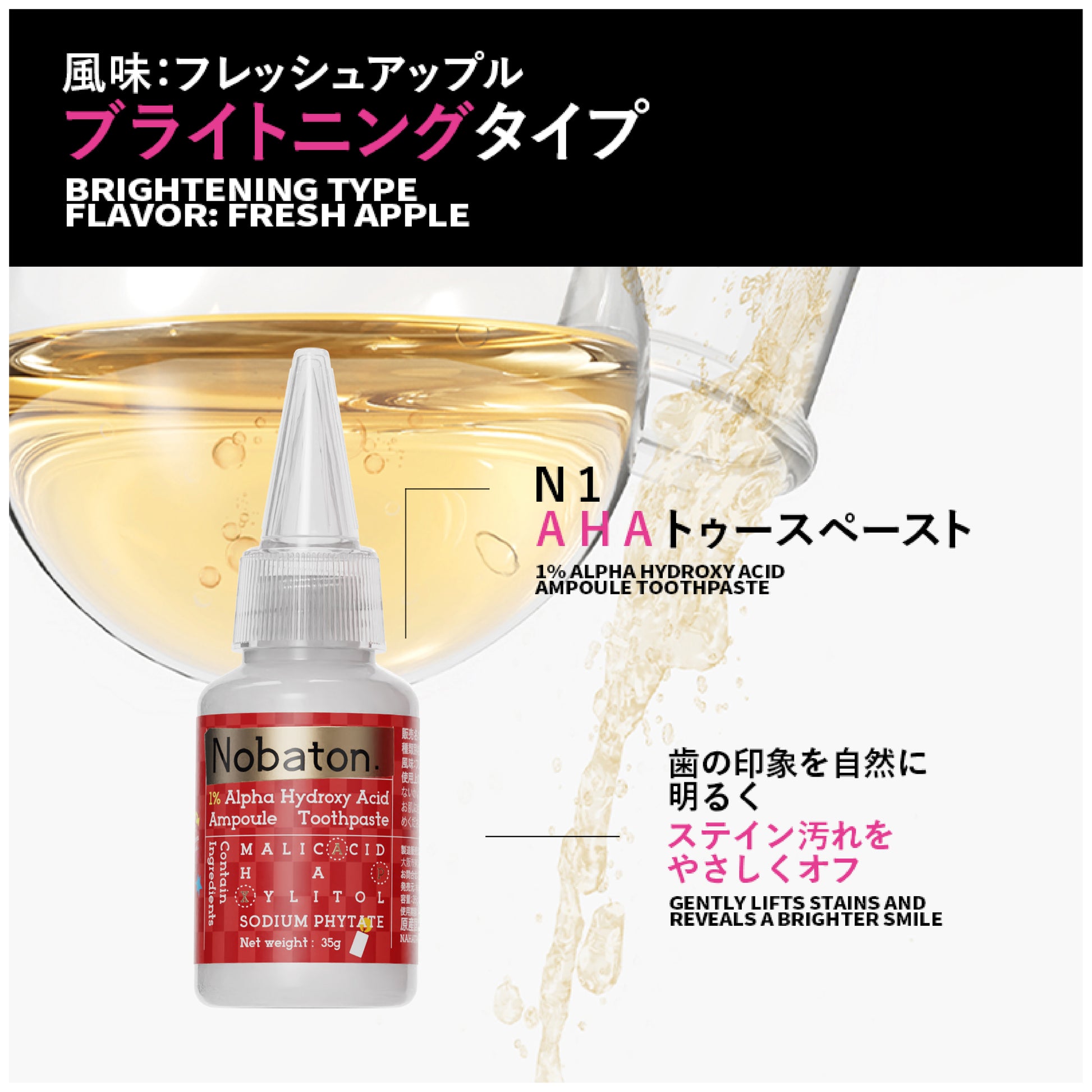 成分 :ソルビトール (保湿剤)、水、含水シリカ(研磨剤)、PEG-8(保湿剤)、グリセリン(保湿剤)、ラウリル硫酸Na(洗浄剤)、香料、ヒドロキシアパタイト(口腔ケア剤)、フィチン酸Na(口腔コンディショニング剤)、セルロースガム(増粘剤)、安息香酸Na(防腐剤)、ピロリン酸4Na(キレート剤)、トチャカエキス(増粘剤)、ラウロイルサルコシンNa(洗浄剤)、スクラロース(甘味剤)、リンゴ酸(調整剤)、キシリトール(甘味剤)、メントール(清涼剤)、o-シメン-5-オール(抗菌剤)、酸化チタン(着色剤)、マイカ(着色剤)