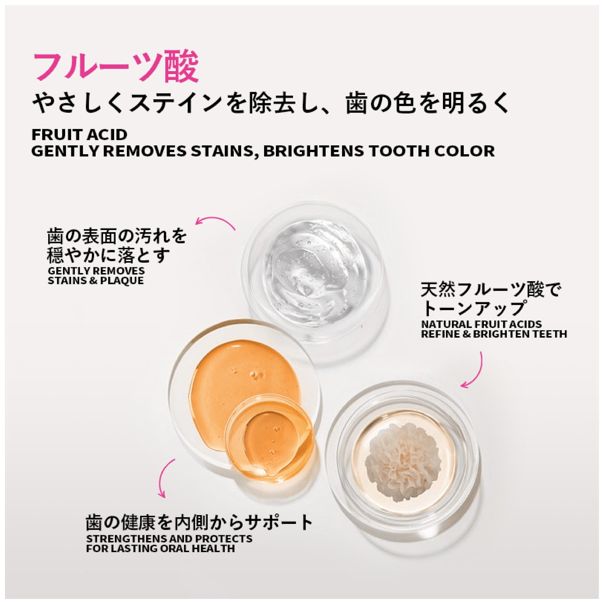製品の特長:歯垢をやさしく除去し、歯の色ムラを整えて、明るくなめらかな印象の口元へ。エナメル質にやさしい設計です。