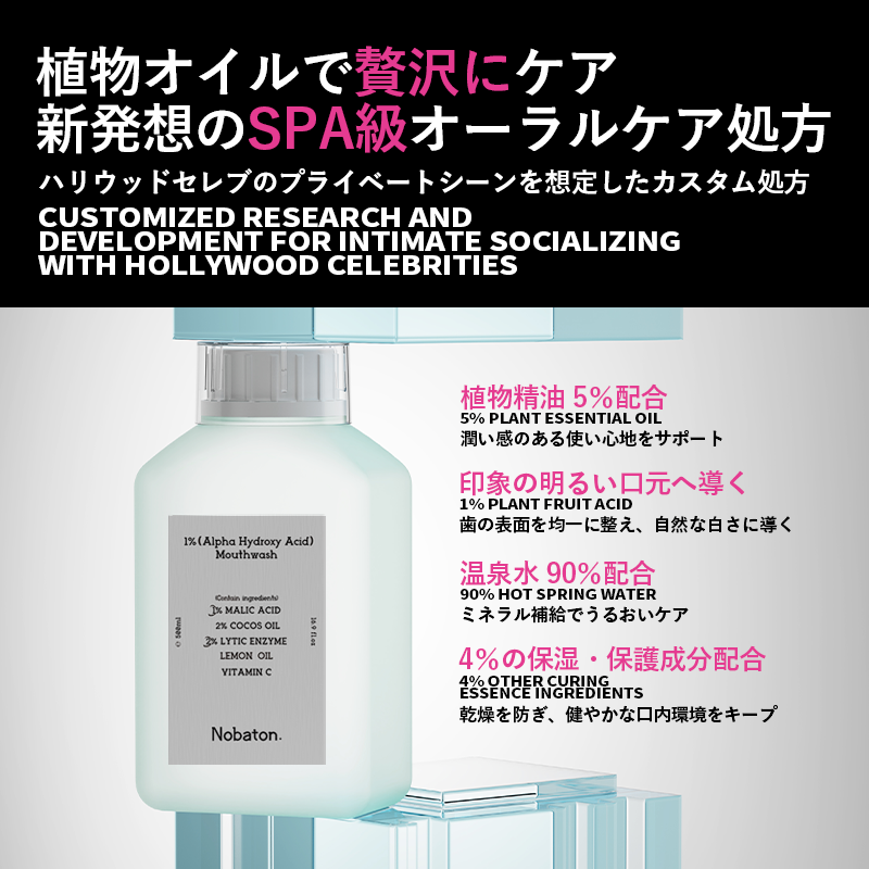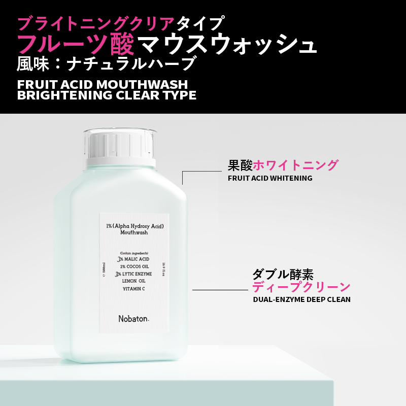 成分 :水、ソルビトール(保湿剤)、ヤシ油(口腔コンディショニング剤)、PEG-40水添ヒマシ油(可溶化剤)、リンゴ酸(口腔コンディショニング剤)、レモン果皮油(口腔コンディショニング剤)、乳酸メンチル(清涼剤)、キシリトール(甘味剤)、安息香酸Na(防腐剤)、乳酸桿菌(口腔コンディショニング剤)、EDTA-2Na(安定剤)、ダイズポリペプチド(口腔コンディショニング剤)、アスコルビン酸(口腔コンディショニング剤)、プロテアーゼ(口腔コンディショニング剤)、リゾチーム(口腔コンディショニング剤)、黄4(着色剤)、青1(着色剤)